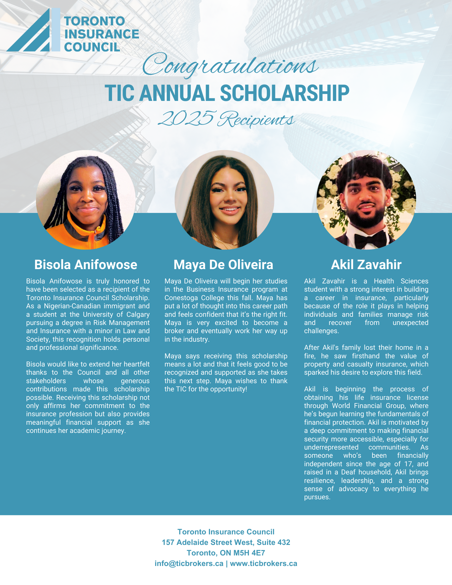 The TIC Scholarship aims to support and encourage diverse candidates to pursue a career in the property and casualty insurance industry. This scholarship offers financial assistance in the form of up to four (4) $3,500 scholarships to applicants with a demonstrated intention to build their careers in this field. Selection is focused on commitment to enter the insurance industry, financial need and contribution to school and/or community life. Academic excellence is not a primary consideration.